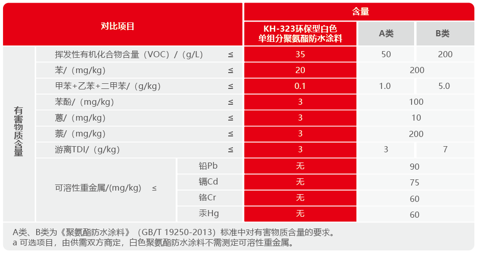 KH-323環(huán)保型白色單組分聚氨酯防水涂料是以異氰酸酯、聚醚多元醇為主要原料,配以各種助劑和填料經(jīng)加工聚合反應(yīng)制成的,使用時涂覆于防水基層上,通過聚氨酯預(yù)聚體中的-NCO端基與空氣中的濕氣接觸后進行化學(xué)反應(yīng),在基層表面形成一層無縫、粘結(jié)力強,整體富有彈性、無毒環(huán)保、堅韌的橡膠防水涂膜。